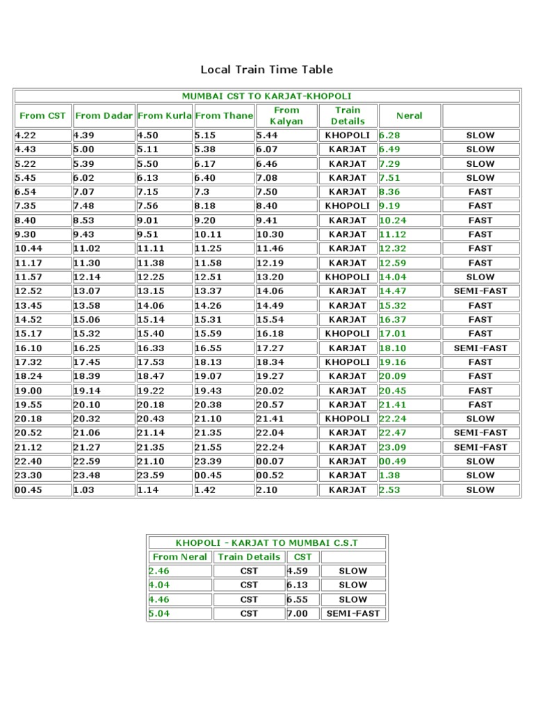 Www Go4mumbai Com Central Railway Local Train Online Timetable Mumbai Cst To Kalyan Karjat Khopoli Kasara Thane To Vashi Train Timetable Neral Train - Local as well as long distance train time table is the running schedule of a particular train.